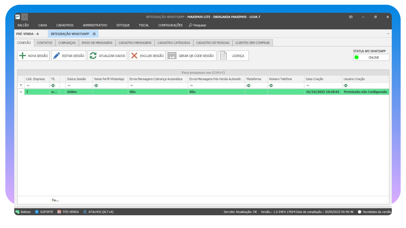 A integração do sistema com o WhatsApp permite que você se comunique de forma eficiente com seus clientes, sem sair do sistema. Dispare orçamentos automaticamente, envie notificações sobre reposição de medicamentos de uso contínuo, lembretes de faturas vencidas e divulgue promoções personalizadas. Tudo integrado, automático e que aumenta a fidelização e as vendas.