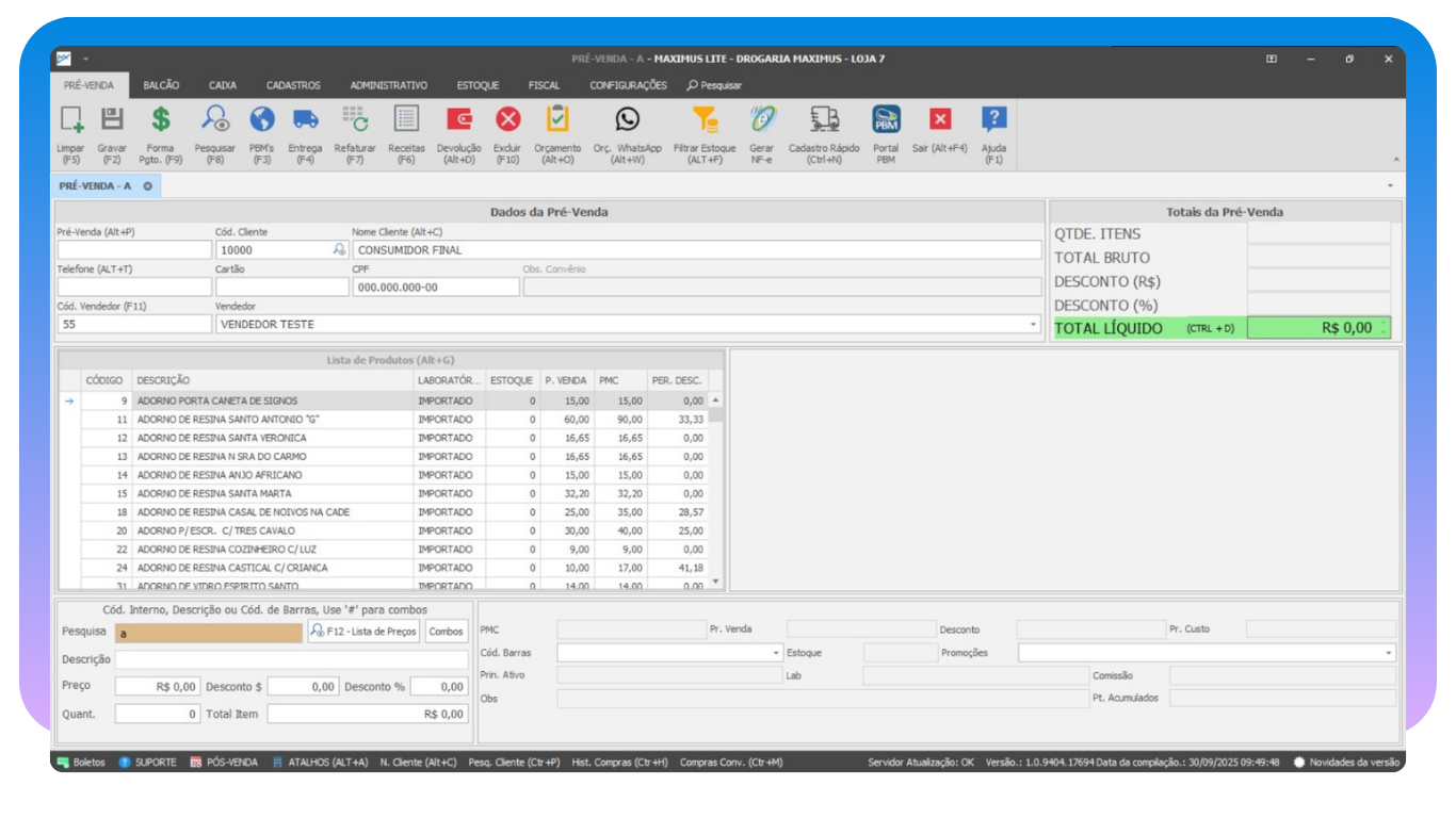 A Maximus Farma é uma solução abrangente que centraliza todas as operações da sua farmácia, vendas, estoque, financeiro, compras e fiscal em um único lugar. Com integrações poderosas com iFood, WhatsApp, PBMs, SNGPC, Google, Farmácias App e muito mais, você tem um ecossistema completo. Atualizações constantes garantem que você sempre tenha acesso às últimas funcionalidades. A robustez do sistema é comprovada por mais de 400 lojas que confiam na Maximus.
