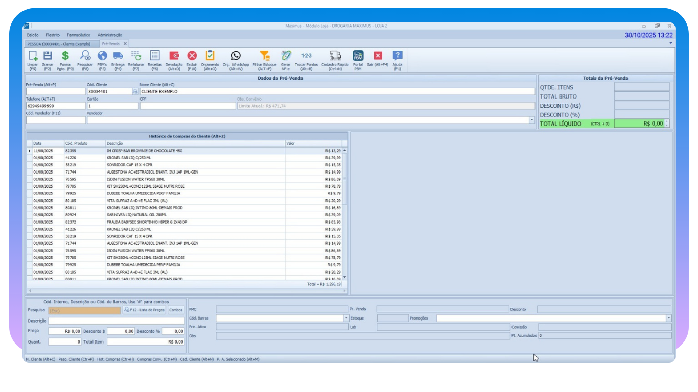 Uma tela de vendas prática e objetiva que centraliza tudo que você precisa. Visualize o histórico de compras do cliente ordenado pela última compra, consulte estoque de filiais em tempo real, integre-se com todos os PBMs para pré-autorização direta, controle medicamentos controlados via SNGPC, resgate pontos de fidelidade e digitalize receitas de Farmácia Popular. Com essa visibilidade completa, você agiliza o atendimento, reduz filas, aumenta o ticket médio e melhora significativamente a satisfação do cliente.